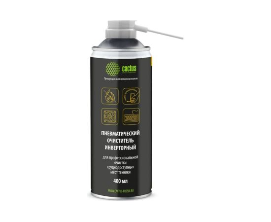 Пневматический очиститель для очистки техники Cactus негорючий, 400 мл, инверторный CSP-AIR400INV предназначен для бесконтактного удаления пыли и мелкого мусора из труднодоступных мест и внутреннего пространства компьютерной техники, аудио-, видео- и фотоаппаратуры, офисной и бытовой техники. Подходит для очистки поверхностей печатных плат, линз оптических приборов, лабораторного, диагностического и другого деликатного оборудования. Допускается очистка приборов, подключённых к электрической сети. Распылительная головка с трубочкой позволяет контролировать направление и силу струи очистителя. При систематическом применении очиститель увеличивает срок службы техники.