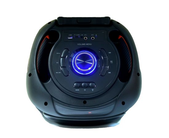 Управление - на верхней панели: питание вкл/выкл, следующая запись/радиостанция, предыдущая запись/радиостанция, воспроизведение/пауза/TWS, выбор режима (источника звука), меню, цветомузыка, эквалайзер. Регуляторы: громкость общая, громкость микрофона