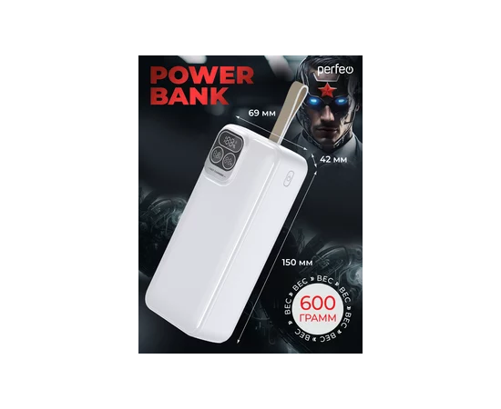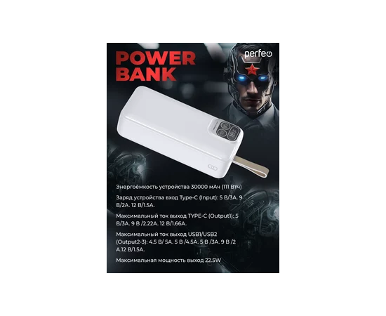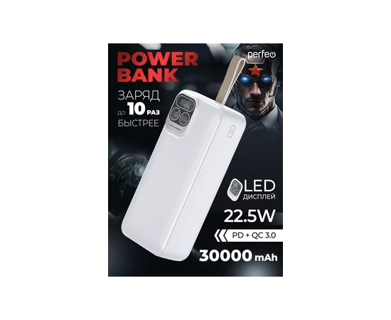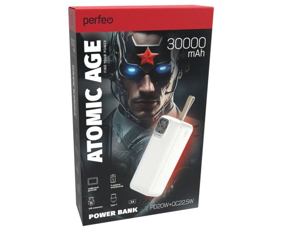 Повербанк Perfeo Atomic Age 30000 mAh/LED дисплей/PD + QC 3.0/Type-C/2 USB/Выход: 5A, max 22.5W/ Белый