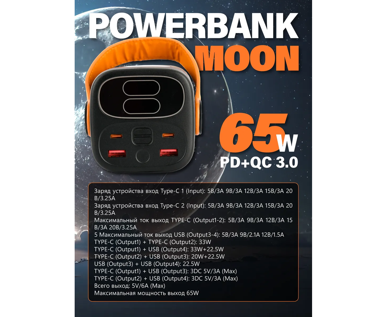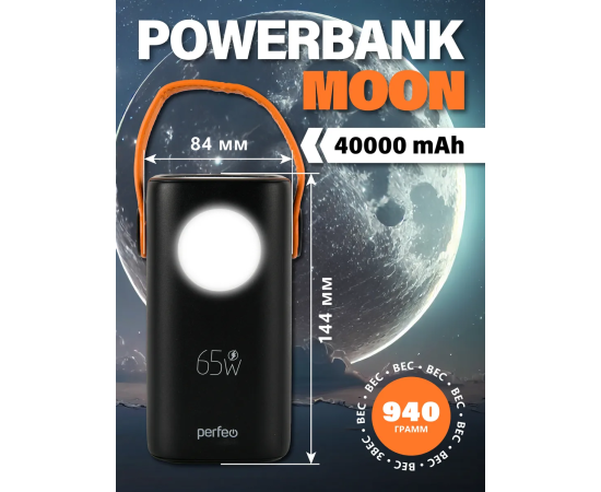 Модель Perfeo Powerbank MOON 65W 40000 mAh/LED дисплей/PD+QC 3.0/2Type-C/2 USB/Выход:5A,max 65W