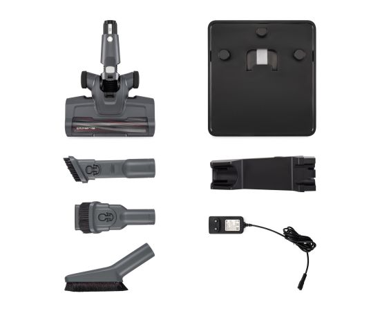 Комплектация: Пылесос, съемная аккумуляторная Li-ion батарея, электрическая щетка для пола с LED подсветкой, щелевая насадка, наадка 2 в 1, мини турбощетка, насадка для люстр, полированных и деликатных поверхностей, труба, насадка для влажной уборки с микрофиброй, напольная подставка - зарядный блок, адаптер, дополнительный щетинный валик, руководство пользователя, гарантийный талон