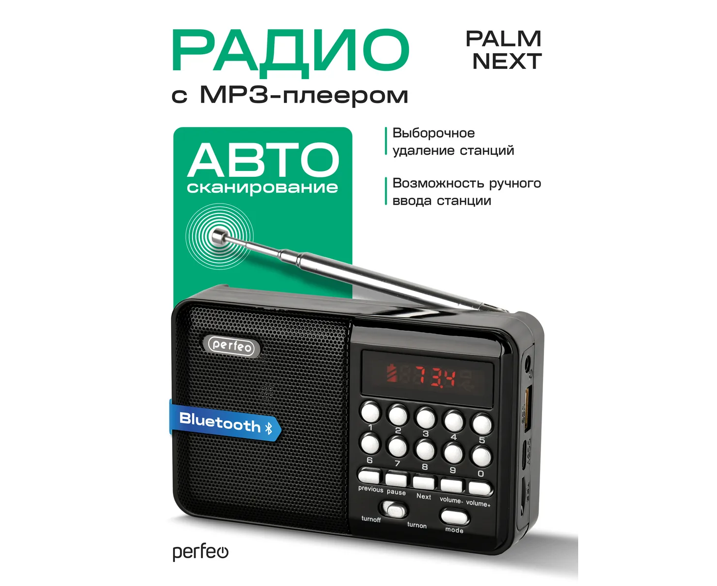 Радиоприемник цифровой Perfeo PALM (i90). Радио с расширенным функционалом умеет воспроизводит MP3-файлы с карт памяти и USB-флэшек. Приемник может работать не только от аккумуляторов (18650), но и от адаптера для зарядки (в комплект не входит) подключенного в сеть 220В. Радиоприемник от сети имеет встроенное цифровой тюнер FM (87,5 – 108 МГц) с автоматическим поиском станций. Радио оснащено поворотной телескопической антенной, возможность воспроизведения музыки с USB flash и microSD карт памяти, вход AUX для подключения источника звука. LED-дисплеем (отображает номера mp3-треков и частоту радиостанции). В комплекте идет кабель miniUSB для зарядки радиоприемника. Радиоприемник мини компактного размера удобно переносить, он помещается в карман. Это радио на аккумуляторе можно слушать даже ночью и не беспокоится, что можно кого-то разбудить, ведь у колонки с радио есть разъем для наушников. Радио PALM – отличный попутчик для поездок, путешествий и прогулок. Радиоприемник от сети и аккумулятора - легкий, удобный, компактный и многофункциональный, не займет много места и не оставит вас без любимой музыки. В нашем ассортименте магазина Perfeo есть множество портативных радиоприемников, они станут отличным подарком для родителей, дедушек и бабушек, подарят хорошее настроение и станут украшением вашего интерьера, прекрасно впишутся в любой дизайн, как дома, так и на даче, незаменимы в походе. Радиоприемник легко зарядить от повербанка, он не прихотлив в использовании.