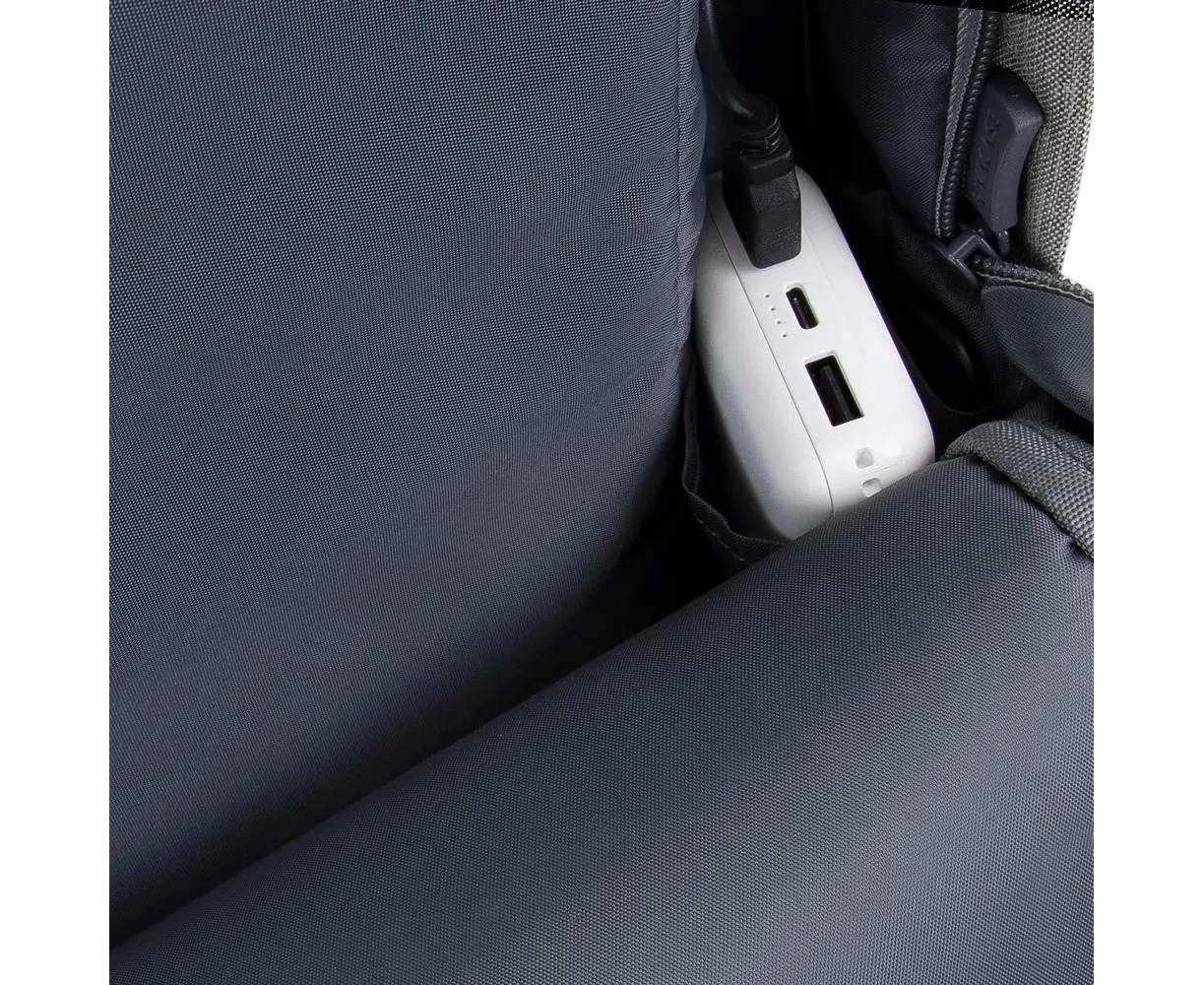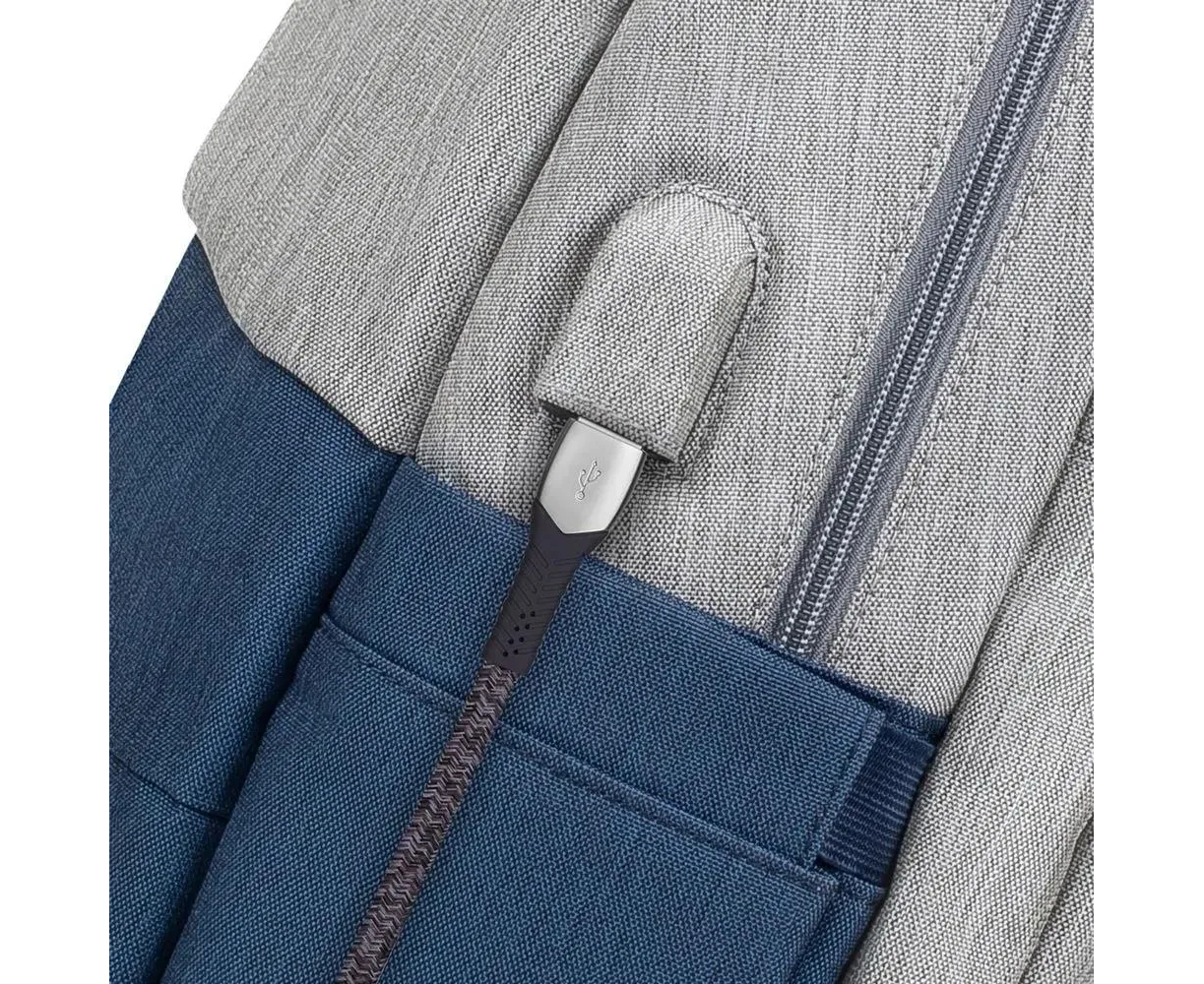 Просторное основное отделение имеет карман на молнии для паспорта и бумажника и два кармана на дне рюкзака - один для мыши, второй для повербанка. На боковой стороне рюкзака имеется USB-порт для подключения портативного внешнего аккумулятора к смартфону.