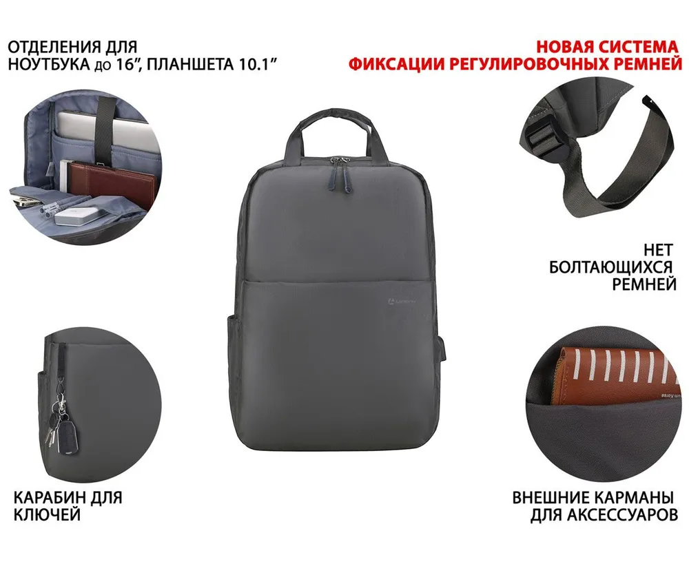 • Дополнительные отделения с фиксатором для ноутбука и планшета до 10.1" / документов формата А4