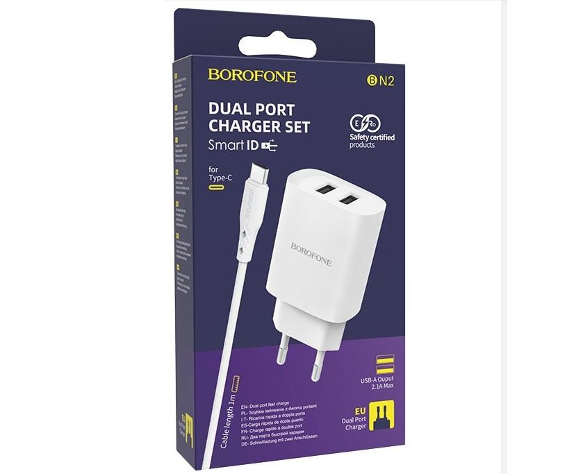 Cетевое устройство Borofone BN2 идет в комплекте с надежным кабелем Type-C.У набора приятный лаконичный дизайн в белом цвете. Для удобства в использовании, на коннекторах находятся ребристые вертикальные линии, благодаря им кабель не скользит в руках.Корпус сетевого устройства сделан из прочного пластика, который приятный на ощупь.Имеет защиту и интеллектуальная идентификационная ИС, благодаря им, зарядка любого гаджета будет безопасной.