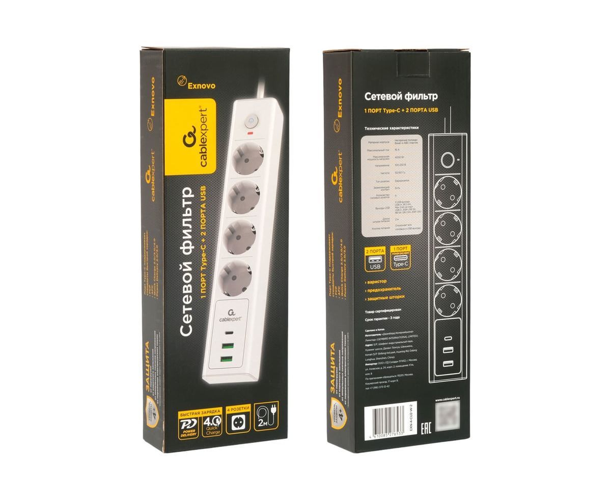 Преимущества Cablexpert exnovo 4р, 16а, 1xtype-c pd, 30вт, 2хusb, 2м, ур.защиты 4+, белый EXN-4-CU2-W-2