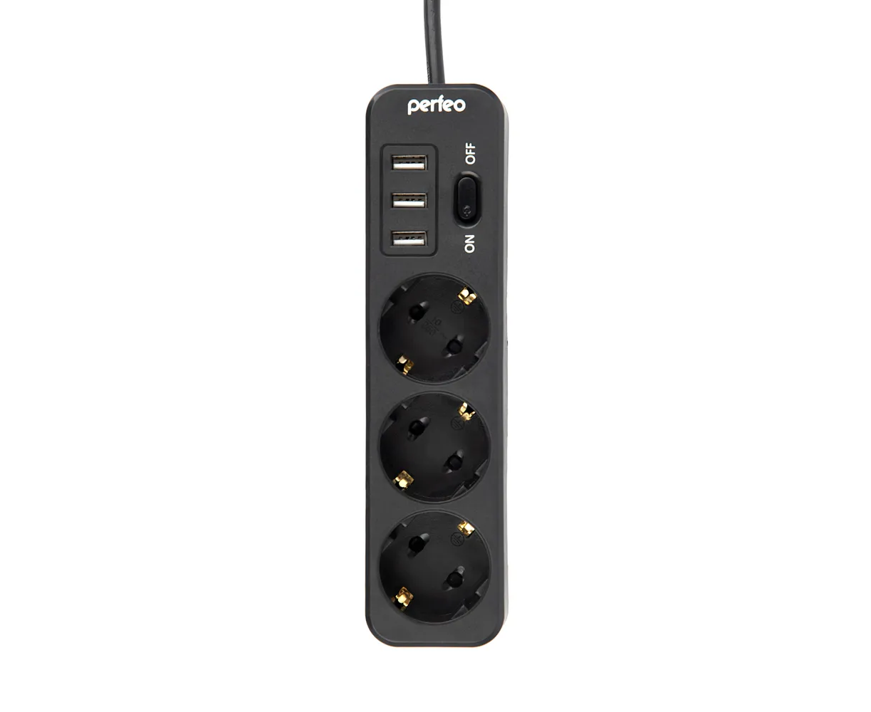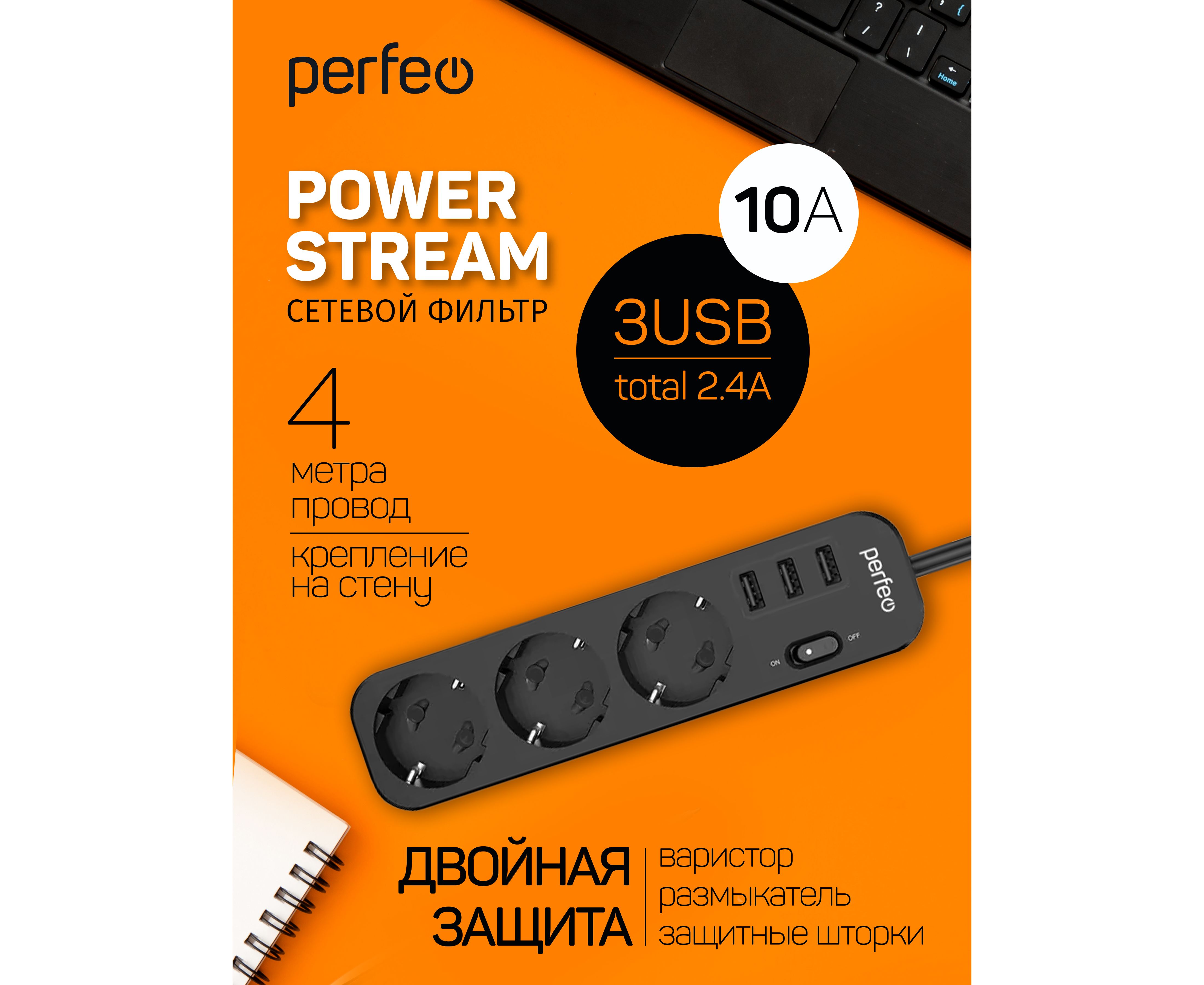 Сетевой фильтр Perfeo "POWER STREAM", 2500W, двойная защита, 4м, 3 розетки, 3 USB, черный.