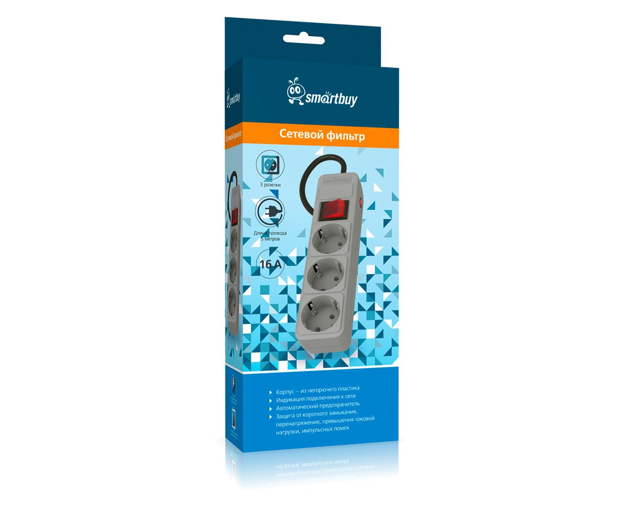 Сетевой фильтр Smartbuy SBSP-3-50-G 16А, 3500 Вт, 3 гнезда, без з/ш, с з/к, ПВС 3x1.0, 5м, серый