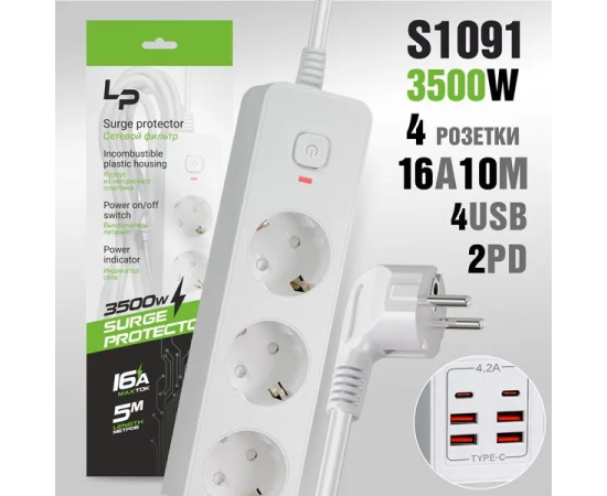 Сетевой фильтр-удлинитель LP LP1017 4розетки С/З 4USB + 2PD 16A с выкл. 5м white