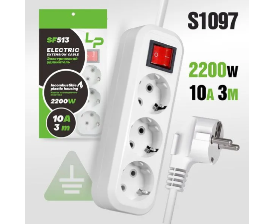 Сетевой фильтр-удлинитель LP SF513 3м С/З с переключателем White