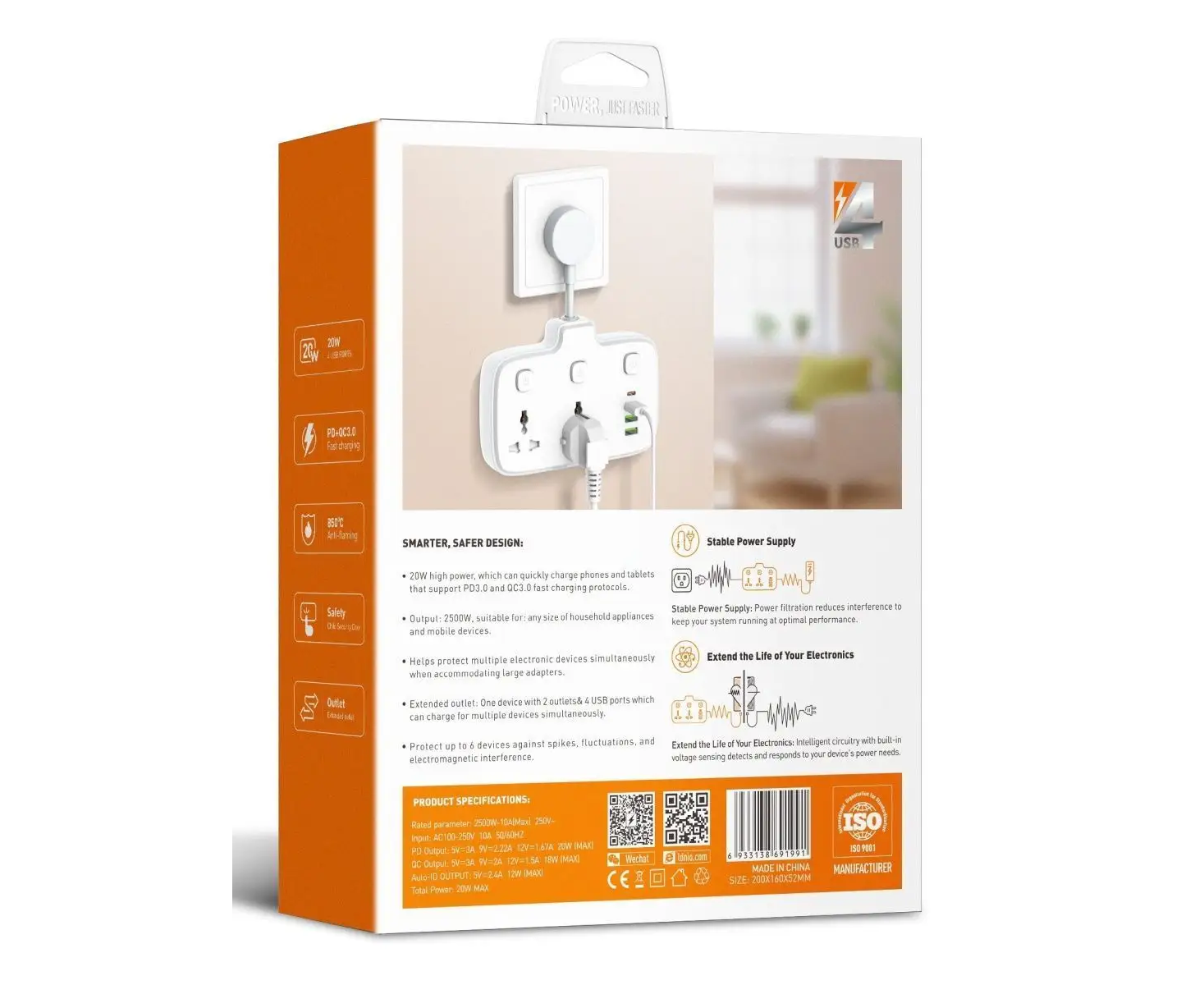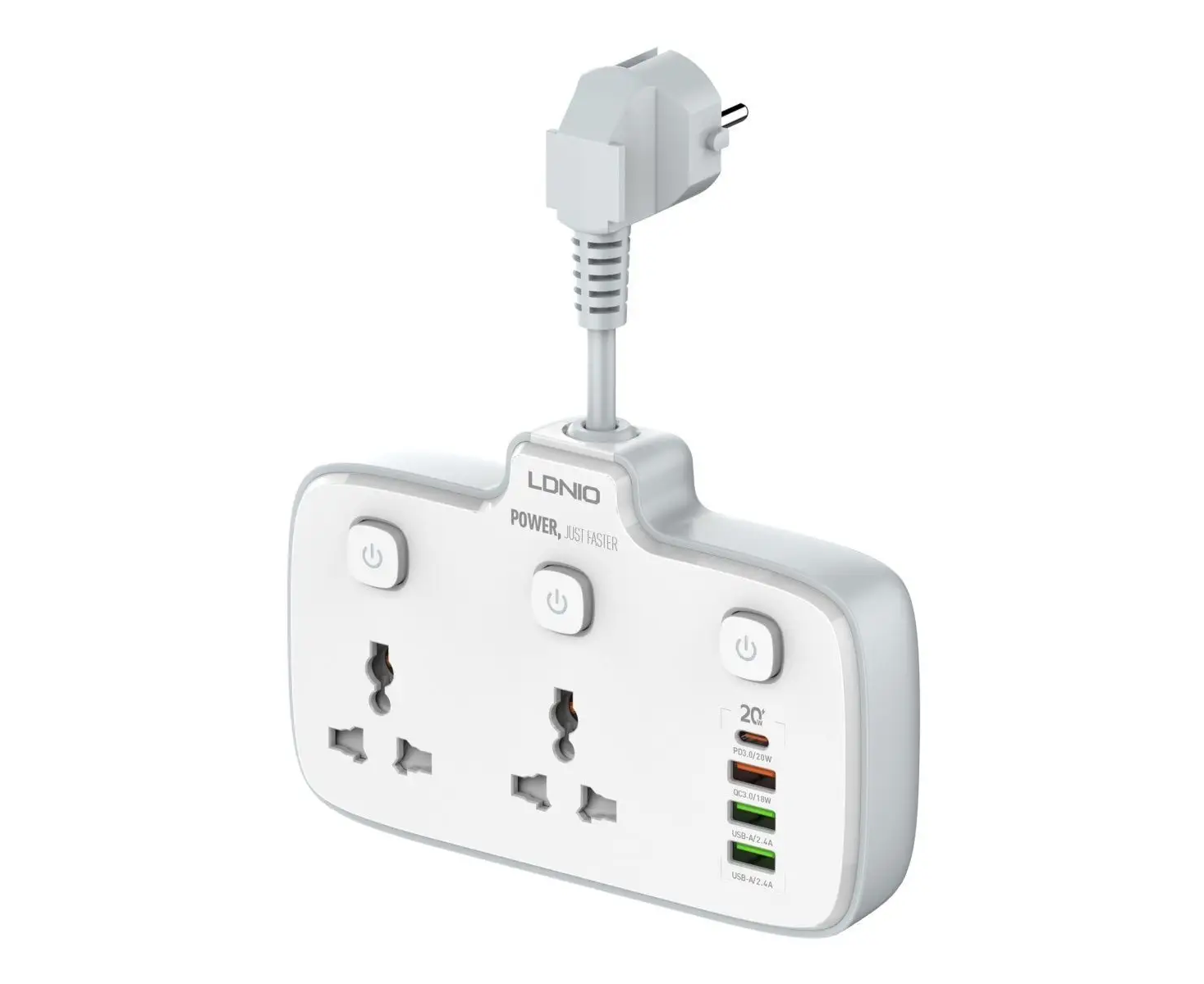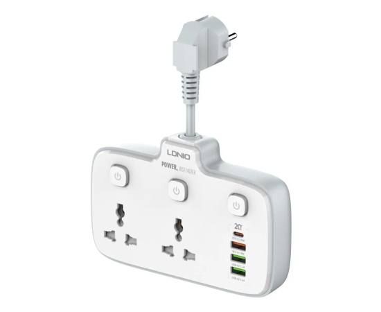 Новинка в мире электротехники - сетевой разветвитель с функцией умной зарядки Ldnio SC2413 на 2 розетки и 4 USB с защитой от перегрузки, короткого замыкания и перегрева. Каждая розетка имеет собственный выключатель. Максимальная мощность потребителей – 2500 Вт. Этот умный тройник с 2 электрическими розетками позволяет подключать не только компьютер и ноутбук, но также и другую технику и аксессуары. Все розетки оснащены специальными защитными шторками от детей – вы можете быть уверены, что никакие посторонние предметы не коснутся контакта под напряжением. Также важной особенностью данного гаджета является то, что он подходит для любых сетевых вилок - Европа, Америка, Китай, Великобритания – специальная конструкция позволяет использовать эти вилки без переходников. 4 USB разъема обеспечивают зарядку электронных гаджетов таких, как телефоны, планшеты, наушники и многие другие. Разъем USB Type-C поддерживает протокол быстрой зарядки PD 3.0 20W (Power Delivery), а разъем USB Type-A - протокол быстрой зарядки QC 3.0 (Quick Charge) с максимальной отдачей 18W с одного порта. Это позволяет заражать как iPhone последнего поколения, так и Android устройства с мощными аккумуляторами. В отличие от многих других сетевых фильтров, предлагаемых на рынке, продукция Ldnio изготавливается из специального негорючего пластика, который сохраняет пожаробезопасность до температуры 750 градусов С. Благодаря элегантному дизайну и компактным размерам, он легко помещается в любом месте дома и можно использовать как в стационарном положении, так и в путешествиях или командировках.