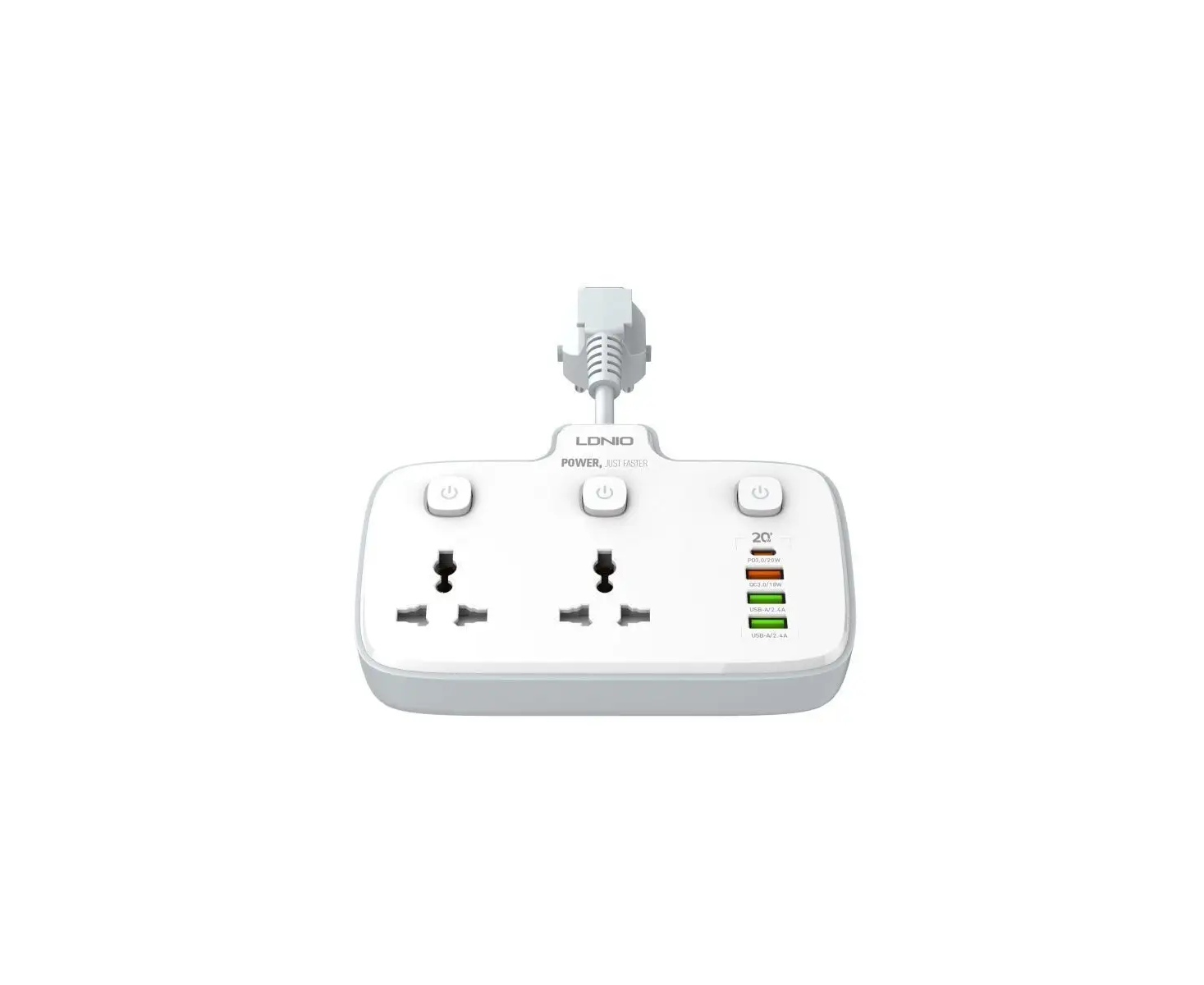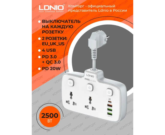 Сетевой разветвитель LDNIO SC2413/ 2 розетки/ 2500W/ 4 USB: QC 3.0+PD 3.0 20W/ Белый, (Арт. LD_B4614)