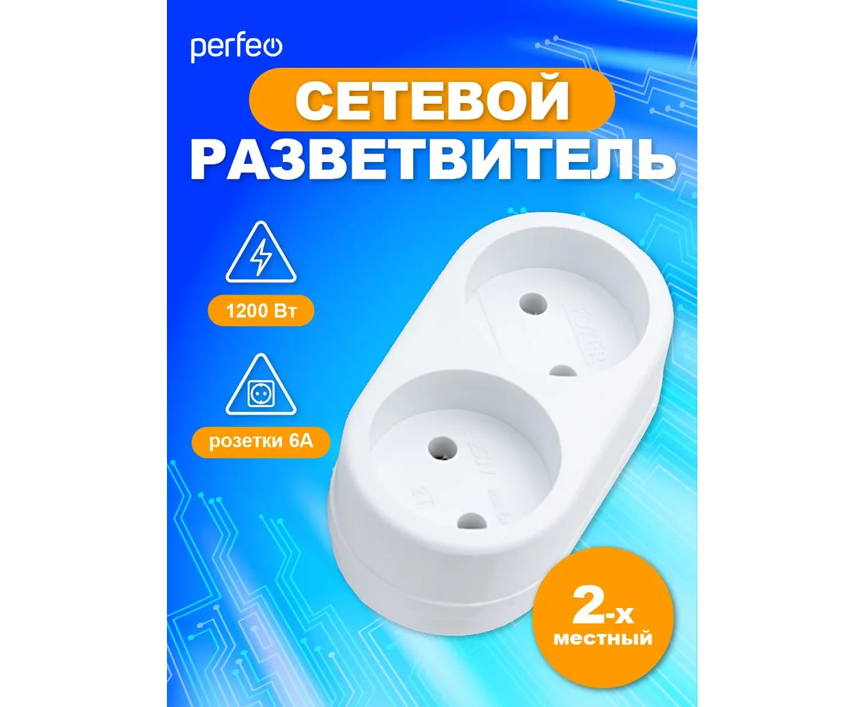 Сетевой разветвитель Perfeo "RU POWER'' 2 гнезда, 6А, без заземления, (2Т), белый