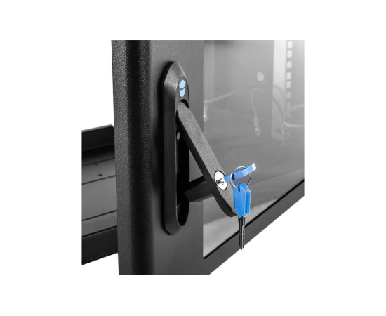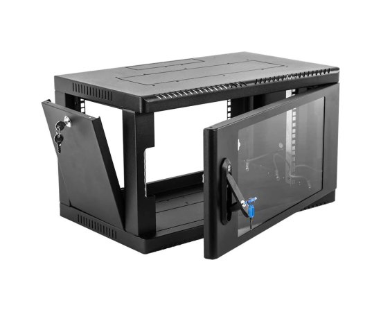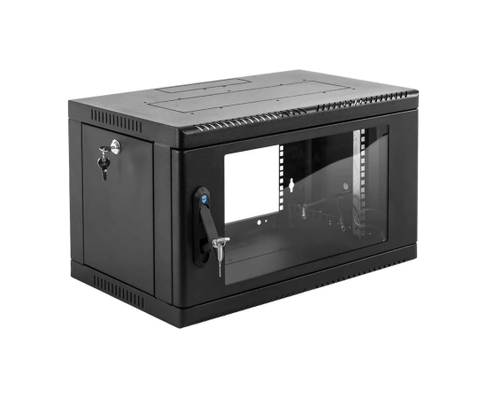 Настенный шкаф 19" ШРН имеет цельнометаллическую сварную конструкцию, он удобен для быстрой установки и монтажа оборудования, так как не требует сборки. Отсутствие острых углов с фронтальной стороны повышают безопасность при эксплуатации и обслуживании шкафов, что помогает исключить человеческие травмы при соприкосновении со шкафом. Комплектация дверью с тонированным ударопрочным стеклом. Новая конструкция стеклянной двери с механическим креплением стекла увеличивает её жесткость, и обеспечивает легкую замену стекла при его повреждении. Возможна установка двери, как с правой, так и с левой стороны. Новый усиленный точечный замок с поворотной ручкой увеличивает жесткость фиксации двери в закрытом положении и защиту от несанкционированного доступа, а также обеспечивает удобство при её открывании.