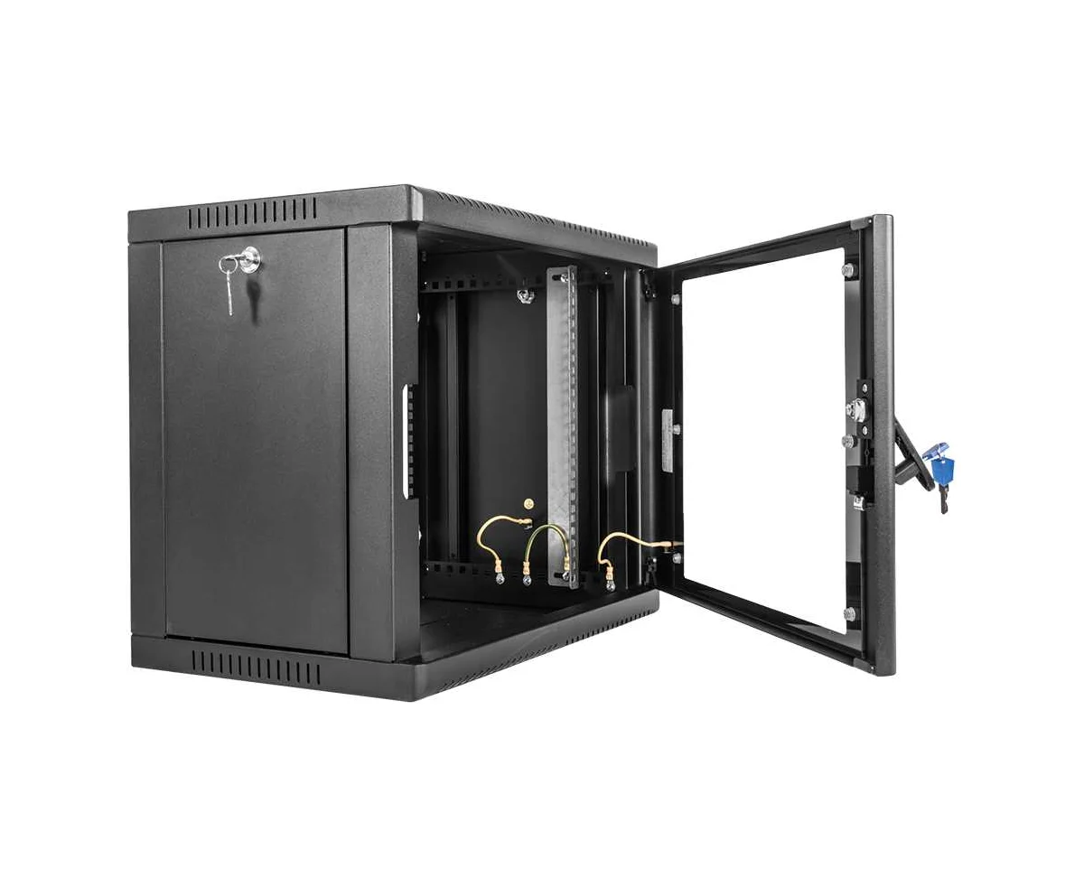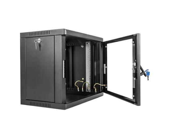 Настенный шкаф 19" ШРН имеет цельнометаллическую сварную конструкцию, он удобен для быстрой установки и монтажа оборудования, так как не требует сборки. Отсутствие острых углов с фронтальной стороны повышают безопасность при эксплуатации и обслуживании шкафов, что помогает исключить человеческие травмы при соприкосновении со шкафом. Комплектация дверью с тонированным ударопрочным стеклом. Новая конструкция стеклянной двери с механическим креплением стекла увеличивает её жесткость, и обеспечивает легкую замену стекла при его повреждении. Возможна установка двери, как с правой, так и с левой стороны. Новый усиленный точечный замок с поворотной ручкой увеличивает жесткость фиксации двери в закрытом положении и защиту от несанкционированного доступа, а также обеспечивает удобство при её открывании.