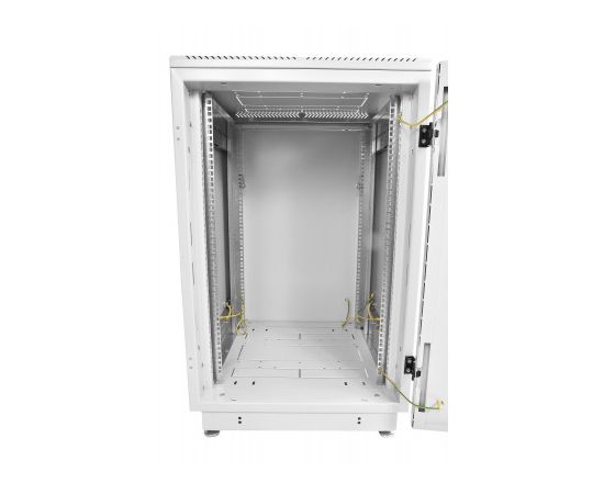 Внутри шкаф оснащён 4 вертикальными направляющими, которые можно регулировать по глубине. На юнитовые направляющие нанесена маркировка, облегчающая монтаж. В стандартном комплекте есть система заземления. Профиль вертикального швеллера дополнен улучшенной перфорацией, что позволяет использовать дополнительное пространство для монтажа разнообразных аксессуаров.