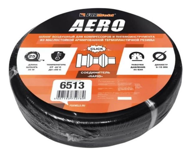 Шланг воздушный с фитингами рапид AERO (25 м; 9x15 мм; 20 бар) FOXWELD 6513 служит удлинителем между компрессором и рабочим инструментом. Достаточная длина оснастки позволяет осуществлять работы на нужном расстоянии от компрессора.