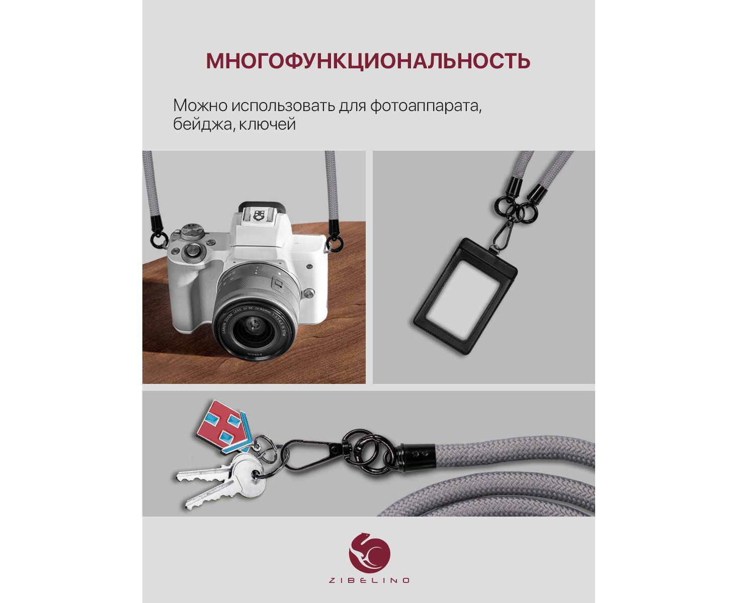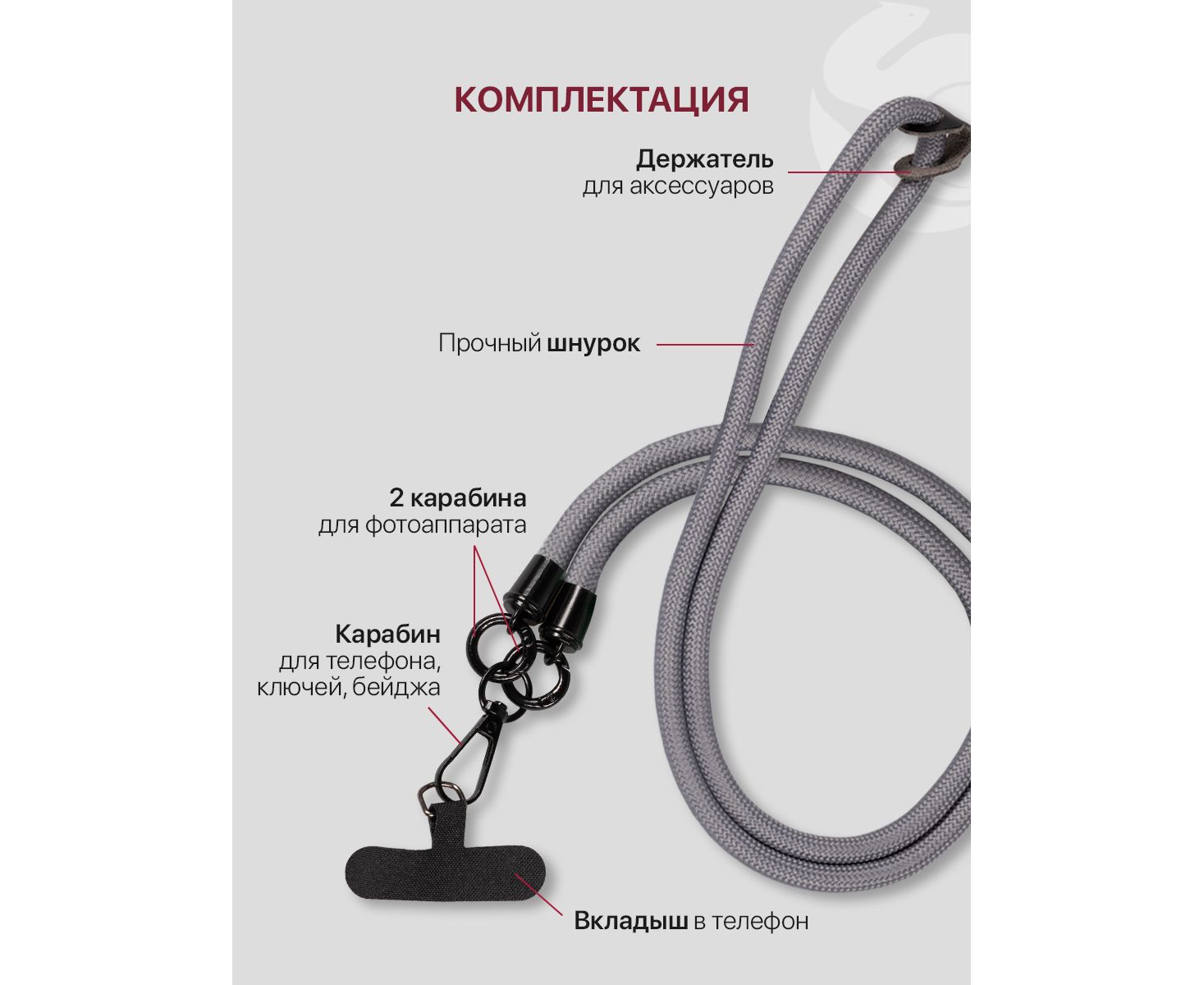 - Петля для аксессуаров и два дополнительных кольца-карабина. Вы можете легко и надежно закрепить на шнурке сразу несколько предметов, чтобы всегда иметь их под рукой.