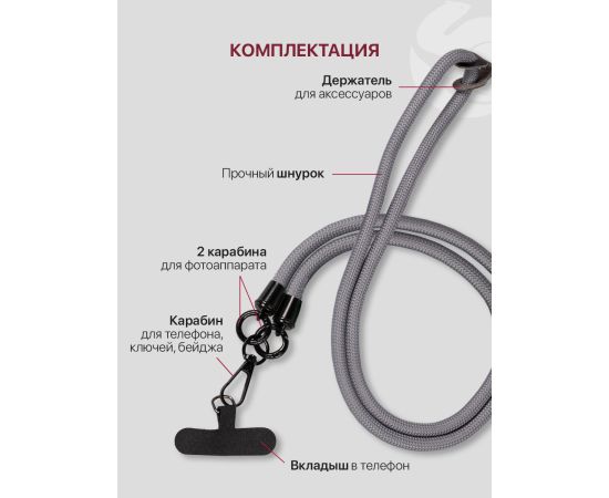 Шнурок универсальный 120см: для телефона на шею, для ключей, бейджа, пропуска, ремешок веревка через плечо, на руку, с карабином нейлоновый регулируемый, серый
