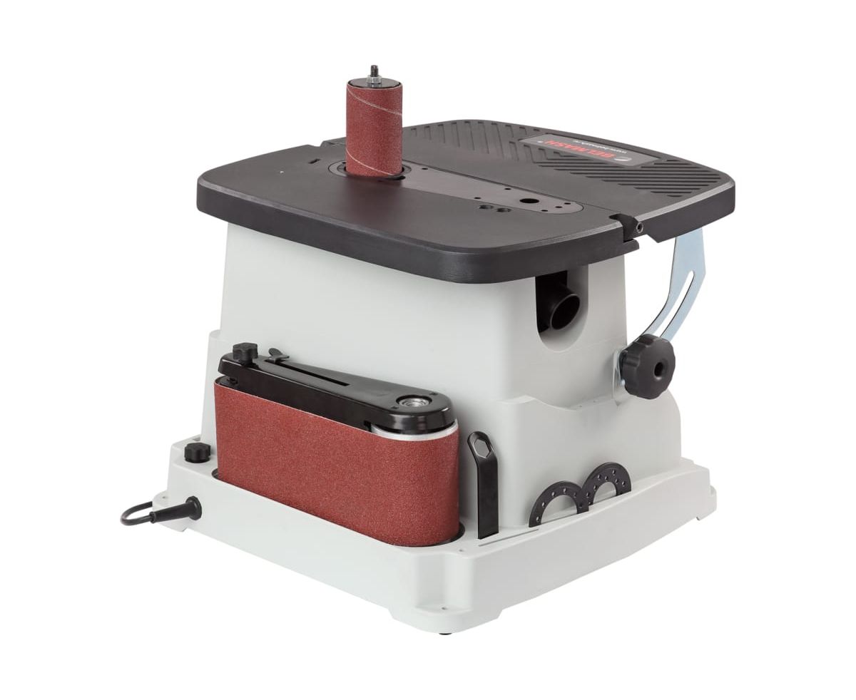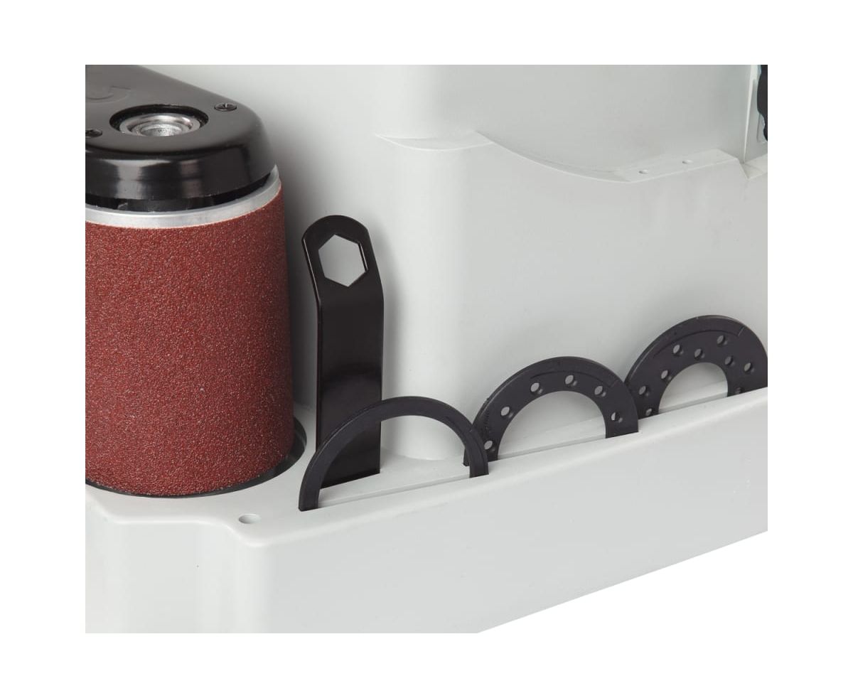 Ленточный узел имеет два обводных ролика разного диаметра, вокруг которых можно работать с вогнутыми поверхностями и прямой участок с металлической подложкой для плоских деталей из дерева. Движение ленты также происходит с осцилляцией, что повышает производительность и качество шлифования. Небольшие габариты и вес обеспечивают легкость размещения станка, а также рациональное хранение и транспортировку. В основании станка расположены ложементы для хранения всей оснастки.