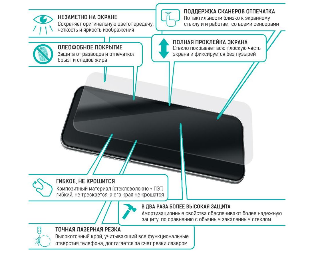 Прочность: 9H/6MOHS. Толщина: 0.2 мм. Защита от пыли, грязи, брызг, царапин. Покрывает всю плоскую часть экрана устройства, сохраняя при этом оригинальную цветопередачу. Верхний слой из стекловолокна по тактильным ощущениям близок к стеклу и не влияет на работу сенсора по всей поверхности экрана. В два раза более высокая защита от повреждений при падении по сравнению с обычным закаленным стеклом. Высокоточная резка лазером, учитывающая все функциональные отверстия мобильного устройства. Полная проклейка поверхности (Full Glue). Специальная смесь высококачественных клеев гарантирует установку без пузырьков воздуха и что стекло не отслоится с течением времени