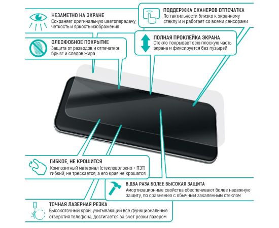 Сохранив гибкость защитной пленки, гибридное стекло намного удобнее обычного закаленного стекла - как при транспортировке, так и при установке. Оно тоньше, прочнее и надежно защищает экран от повреждений. Стекло имеет отступы по 1 мм от края дисплея для удобства ношения защитного чехла. Стекло имеет высокую степень устойчивости к царапинам, обеспечивает хорошую чувствительность к касанию и не влияет на сенсорный отклик по всей поверхности дисплея. Оно идеально прозрачное, не снижает четкость и яркость изображения, не меняет оригинальную цветопередачу экрана. Изготовлено из гибкого композиционного материала (стекловолокно и ПЭТ). Является гибким и не растрескивается, а края не крошатся, как у обычного закаленного стекла.