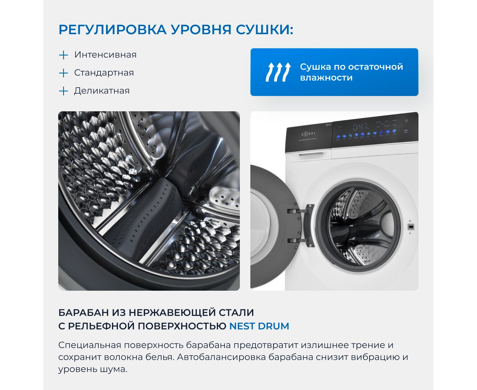 Регулировка уровня сушки: Интенсивная/Стандартная/Деликатная