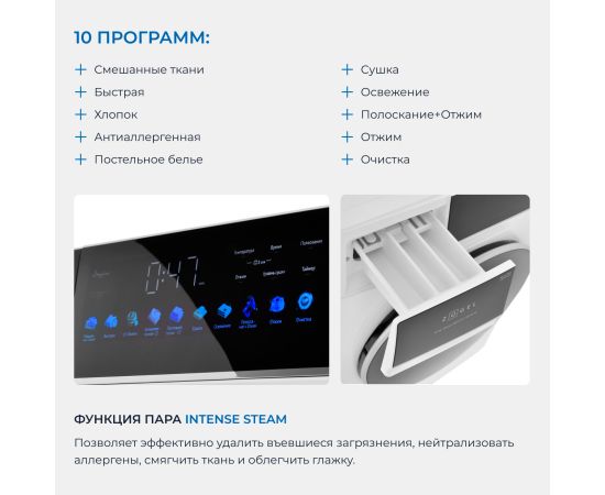Функция Пар на программах Антиаллергенная/Постельное белье позволяет бережно, но эффективно удалить въевшиеся загрязнения, дезинфицировать и нейтрализовать аллергены, прекрасно освежает и смягчает ткань, облегчает глажку