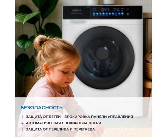 Инверторный бесщеточный двигатель с прямым приводом обеспечивает экономное потребление электроэнергии и низкий уровень шума при работе, гарантирует высокое качество стирки и отжима, надежность и долговечность