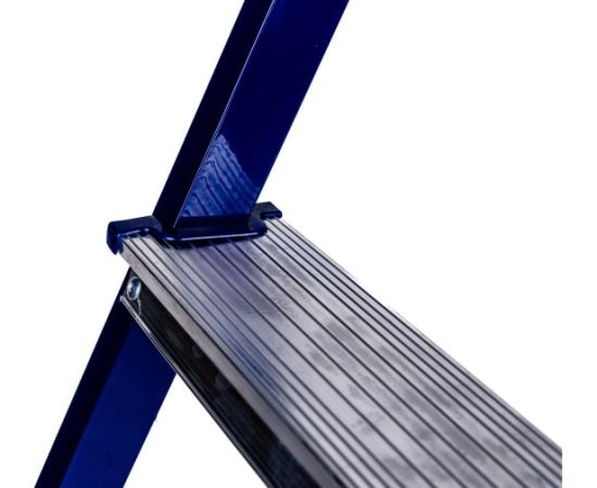 Стальная стремянка Алюмет М8304 выполнена из прямоугольного профиля и окрашена синей полимерной краской. Эта модель рассчитана на высокую нагрузку, обеспечивает хорошую устойчивость как всей конструкции, так и каждой ступеньки по отдельности. Ступени выполнены из алюминия, имеют специальное рифление, что снижает вероятность скольжения во время работы. Применяется в быту и строительной области.