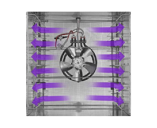В сушилке установлен мощный нагревательный элемент и вентилятор с лопастями большого диаметра, обеспечивающий равномерное распределение нагретого воздуха по всему объему камеры. Благодаря горизонтальному обдуву смешение запахов при сушке одновременно разных продуктов минимально.