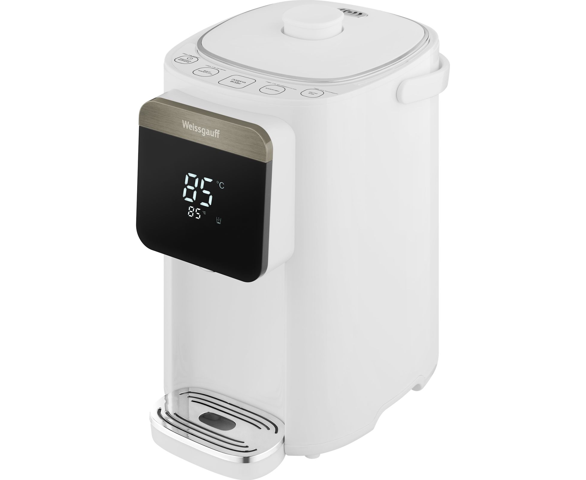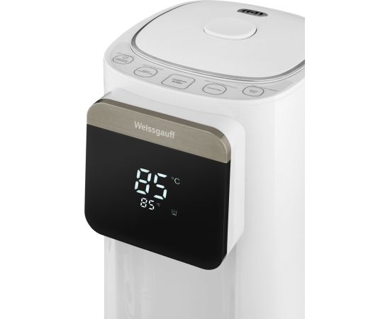 Вместительный и функциональный накопительный термопот от Weissgauff, выполненный в белом цвете, обладает баком для воды объемом 5 литров, возможностью поддержания требуемой температуры в диапазоне от 45 до 95 °C, а также 6 уровнями регулировки нагрева, функциями повторного кипячения, быстрой очистки и приготовления щелочной воды.