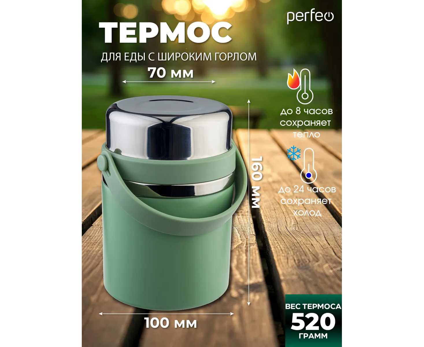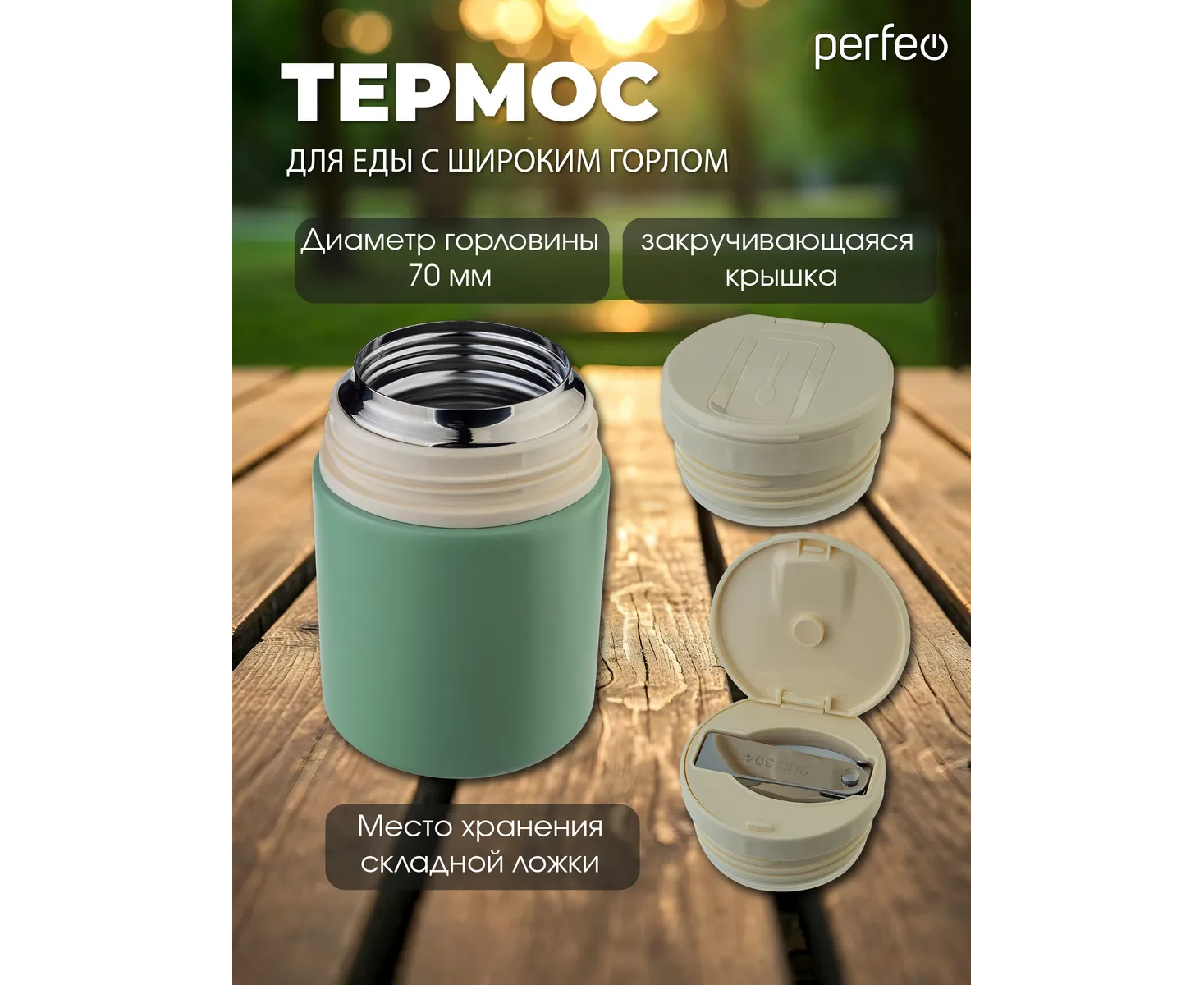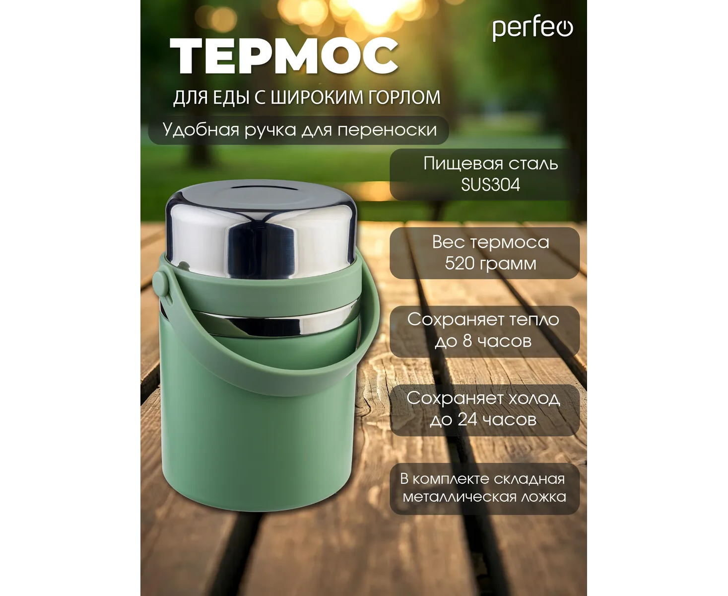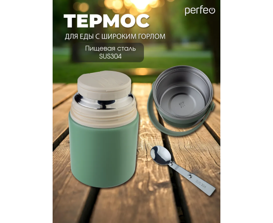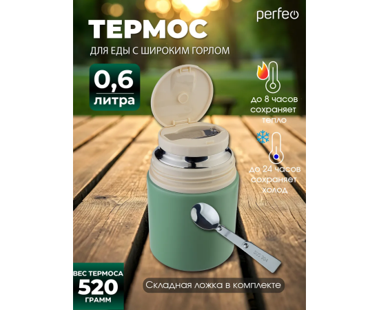 Термос для еды PERFEO с широким горлом, ручкой, ложкой, объем 0,6 л., оливковый, (Арт. PF_E2320)
