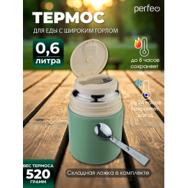 Термос для еды PERFEO с широким горлом, ручкой, ложкой, объем 0,6 л., оливковый, (Ар...