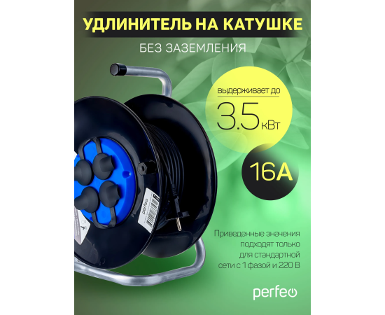 Удлинитель на катушке Perfeo без заземления "RU POWER" 20м 4гн 16А ПВС 2х1,5 IP44 (РБК16), (Арт. PF_C3353)