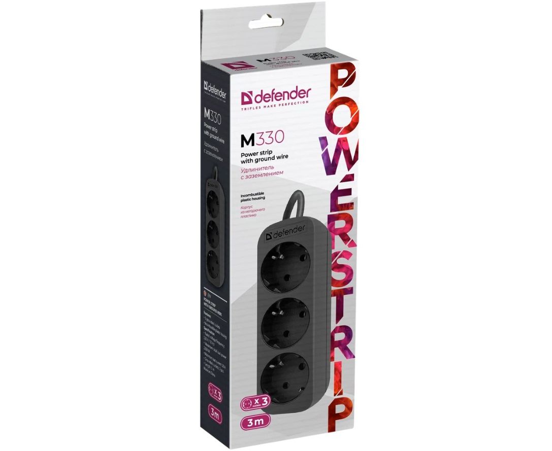 Сетевой фильтр DEFENDER с заземлением M330 3.0 м, 3 розетки, черный (99322)