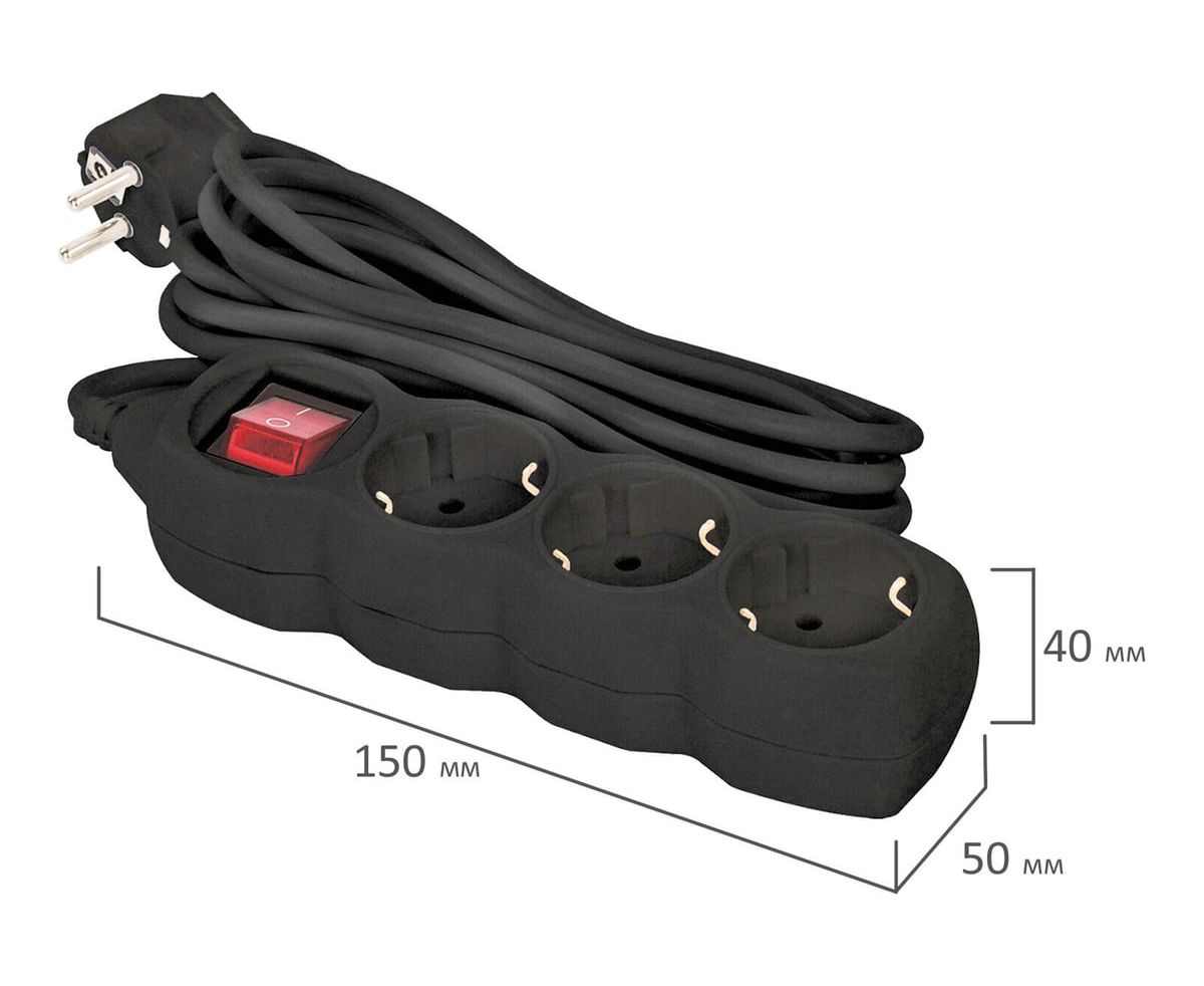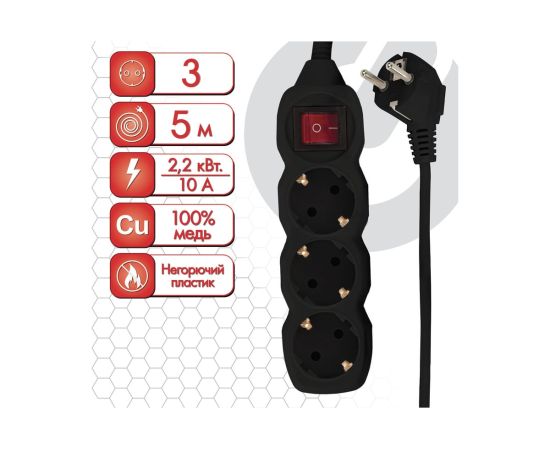 Удлинитель сетевой SONNEN U-133GS (513267) 3 розетки, c заземлением, выключатель, 10А, 5м, черный