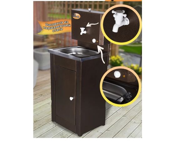 Умывальник ВИХРЬ отличается особой функциональностью, так как его можно установить как внутри дома, так и снаружи. Внутри тумбочки ставиться ведро или шланг для слива воды. Так как в таком умывальнике есть раковина, то его можно свободно использовать для мытья посуды.