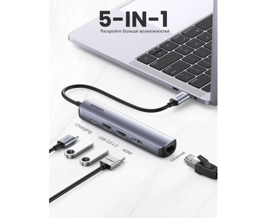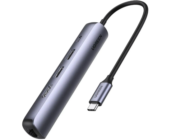 USB Hub UGREEN CM418 10919 USB-C to 2*USB 3.0+HDMI+RJ45 Ethernet Adapter+PD space gray