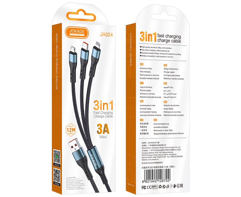 USB кабель JOKADE JA024 3-in-1 Fast Charging Cable 1.2 m black