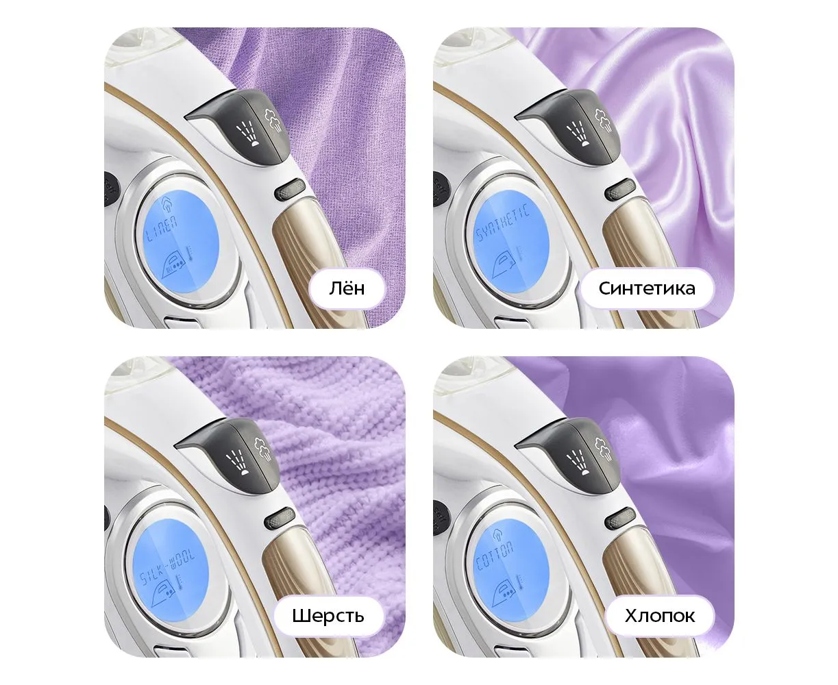 Всего прибор имеет 4 уровня нагрева, которые подойдут для синтетики, шёлка и шерсти, хлопка и даже льна. Включённый режим отображается на дисплее под ручкой прибора.