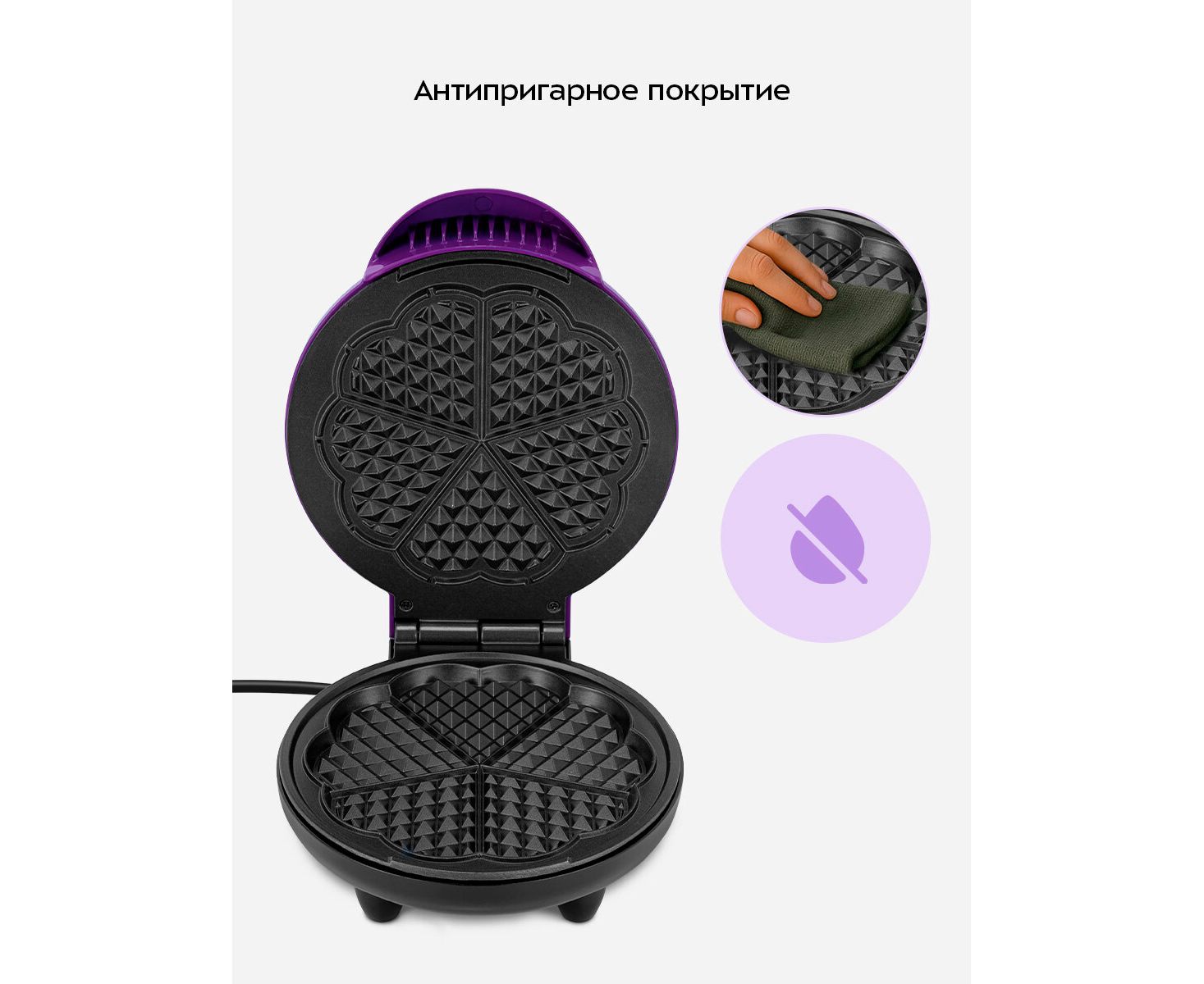 Благодаря антипригарному покрытию тесто не прилипает к панелям, что упрощает процесс приготовления и позволяет делать идеальные вафли без лишних усилий. Также антипригарное покрытие позволяет готовить без масла и облегчает чистку панелей.