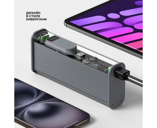 Назначение: Устройство предназначено для восполнения заряда портативной техники, способной питаться от портов USB A и USB C с напряжением не более 12V и мощностью не превышающей 20Вт, передавая энергию от встроенного аккумулятора.