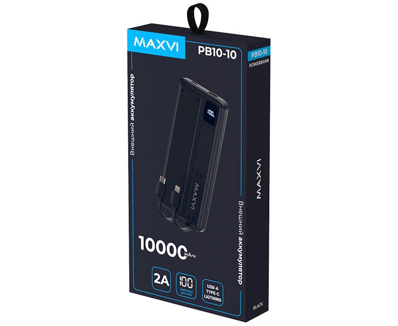 Внешний аккумулятор Maxvi PB10-10 10000мАч, 2A USB + кабели: Type-C/Lightning