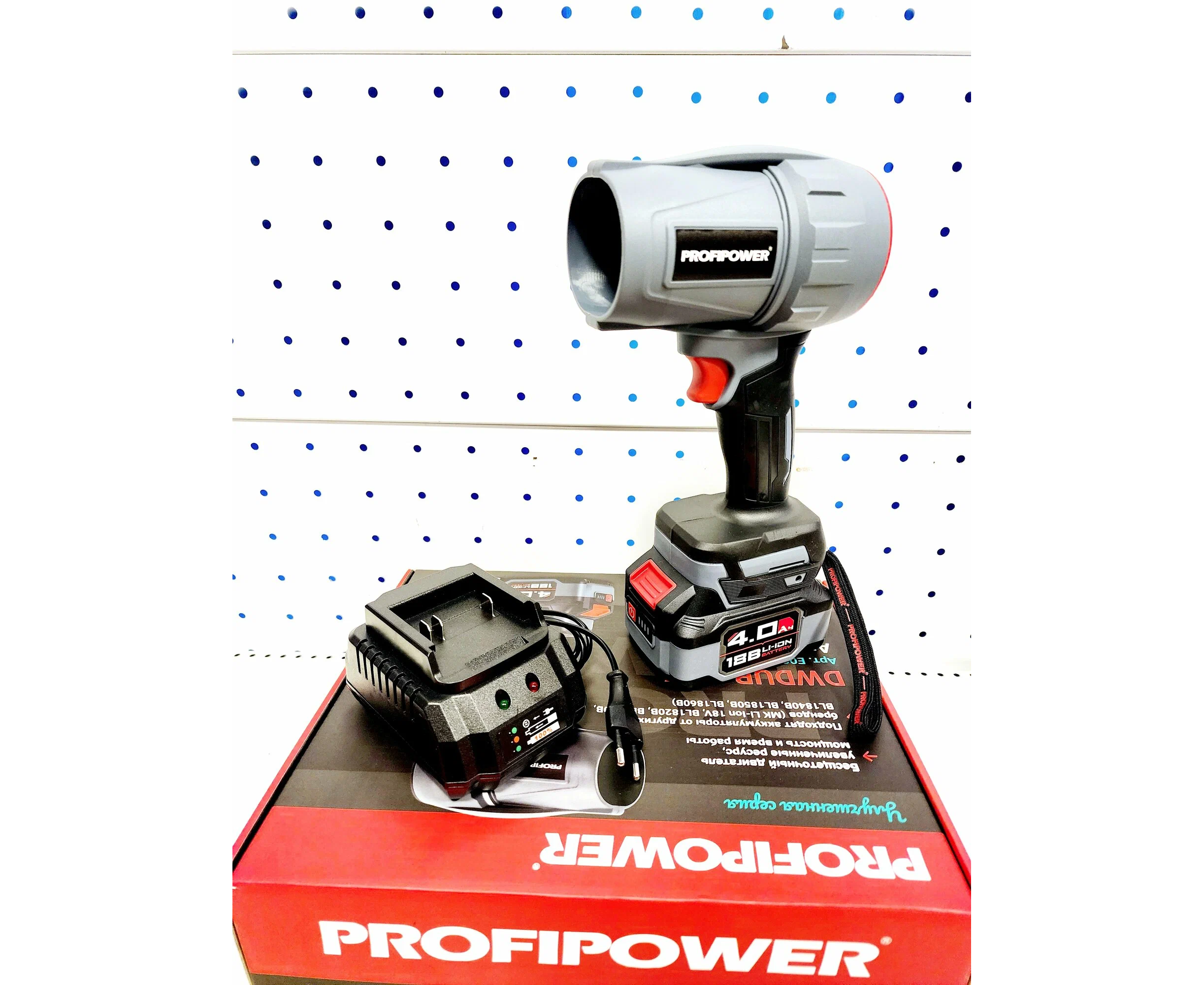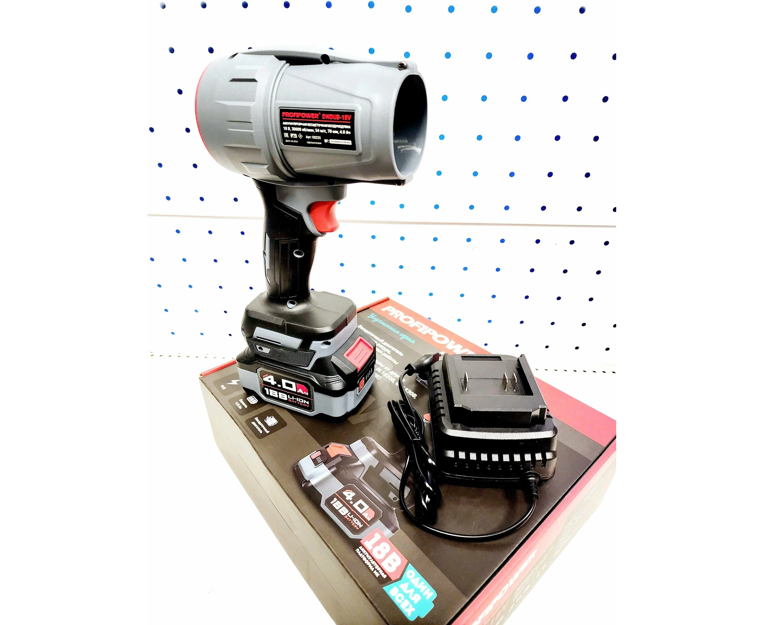 Аккумуляторная воздуходувка; аккумулятор 1шт; зарядное устройство; коробка; тех.паспорт