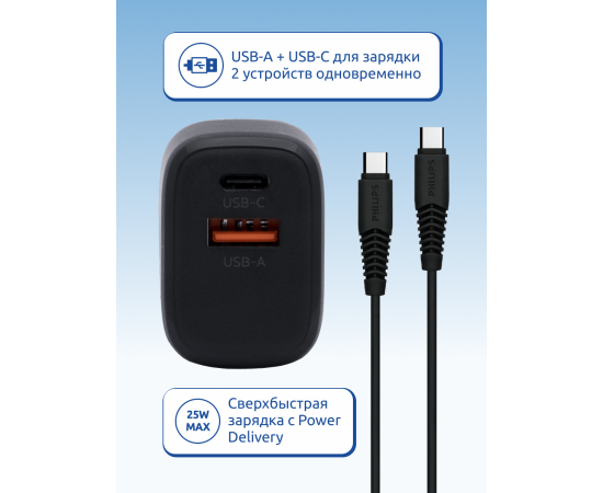 Зарядное устройство для телефона Philips DLP2560DB/97 Travel, USB-C и USB-A, 25W, кабель Type-C Type-C, быстрая зарядка QC3.0, чёрный
