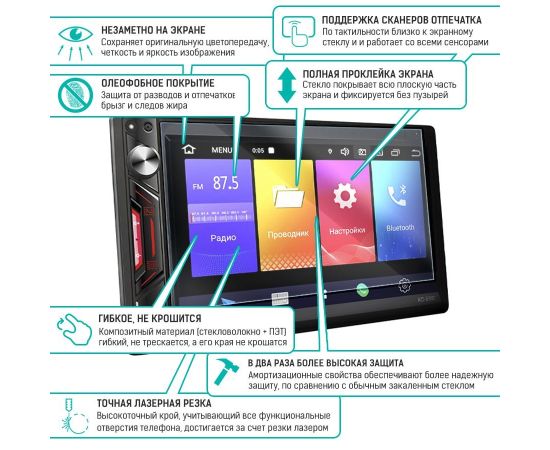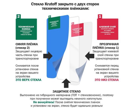 ГИБРИДНОЕ защитное стекло сохраняет гибкость защитной пленки, и прочность стекла. Оно намного удобнее обычного закаленного стекла - как при транспортировке, так и при установке. Гибридное стекло тоньше, прочнее и надежно защищает устройство от повреждений. Оно имеет высокую степень устойчивости к царапинам, обеспечивает хорошую чувствительность к касанию и не влияет на сенсорный отклик по всей поверхности дисплея. Идеально прозрачное, не снижает четкость и яркость изображения, не меняет оригинальную цветопередачу. Изготовлено из гибкого композиционного материала (стекловолокно и ПЭТ). Верхний слой из стекловолокна по тактильным ощущениям близок к стеклу и не влияет на работу сенсора по всей поверхности экрана. Гибридное стекло гибкое, оно не растрескивается и не крошится, как обычное закаленное стекло. Защищает от пыли, грязи, брызг и царапин. Полная проклейка поверхности (Full Glue). Специальная смесь высококачественных клеев гарантирует установку без пузырьков воздуха и что стекло не отслоится с течением времени. Гибридное стекло поставляется в двух защитных транспортировочных пленках (на тыльной и лицевой стороне). Данные пленки могут быть поцарапаны. После наклеивания стекла снимите защитную синюю пленку "2" с лицевой стороны!