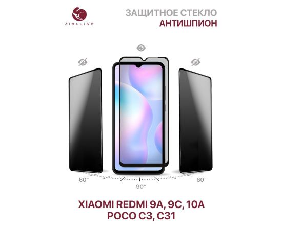 Защитное стекло Privacy антишпион для Xiaomi Redmi 9A, 9C, 10A, Poco C3, C31 с рамкой (Сяоми Редми 9А 9С 10А Поко С3 С31)